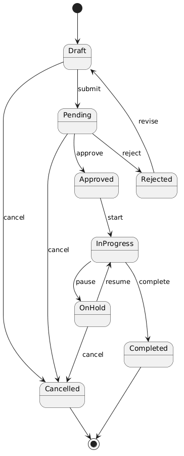 Состояния: Draft, Pending, Approved, InProgress, Completed, Cancelled